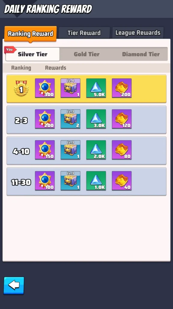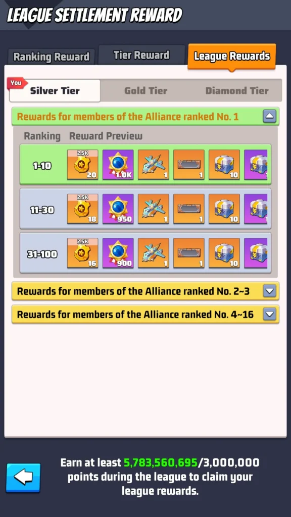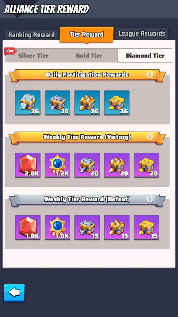 Ranking Rewards are divided into daily rewards, weekly rewards, and seasonal rewards. The quality of these rewards depends on your alliance’s tier, which can be Silver, Gold, or Diamond.